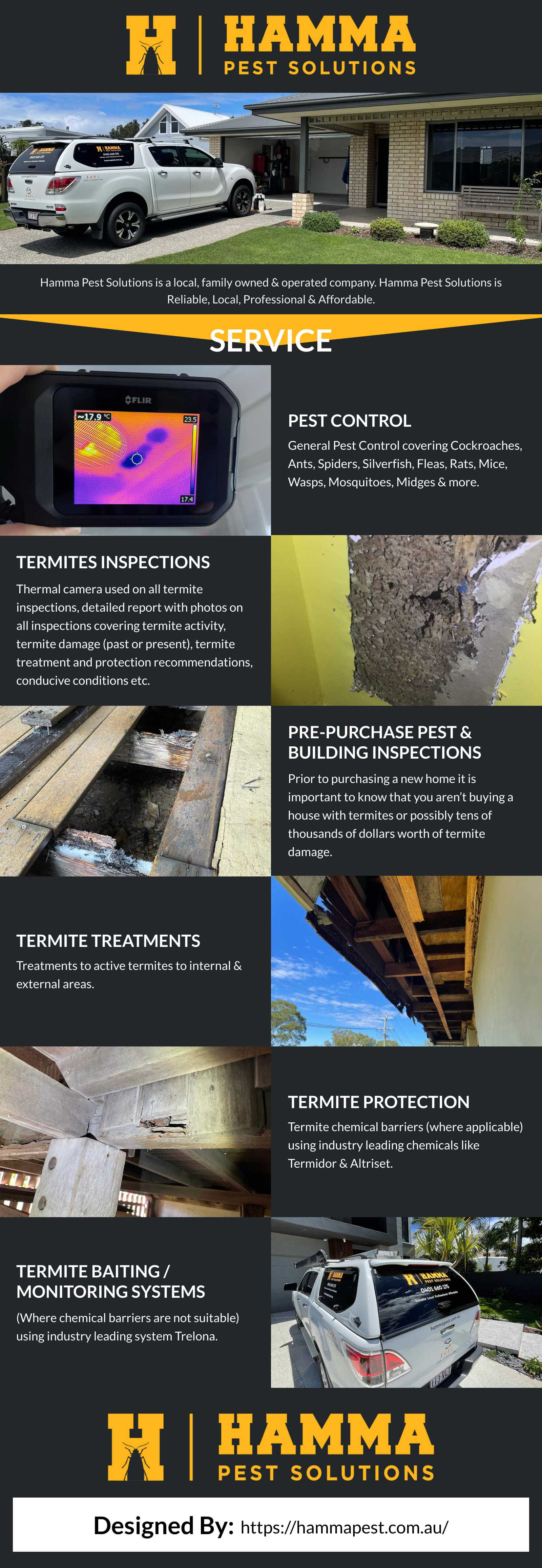 Hamma Pest Solutions are your local, family owned operated pest control termite management experts. Mark Hamilton is the owner operator who has 20 years local industry experience. We are fully licensed and insured to provide pest and termite management to your property. We use all the latest products and technologies including thermal cameras to safely keep you, your family, pets and your property pest free. Hamma Pest Solutions are honest, professional, reliable, and most importantly affordable covering all aspects of pest control and termite management.